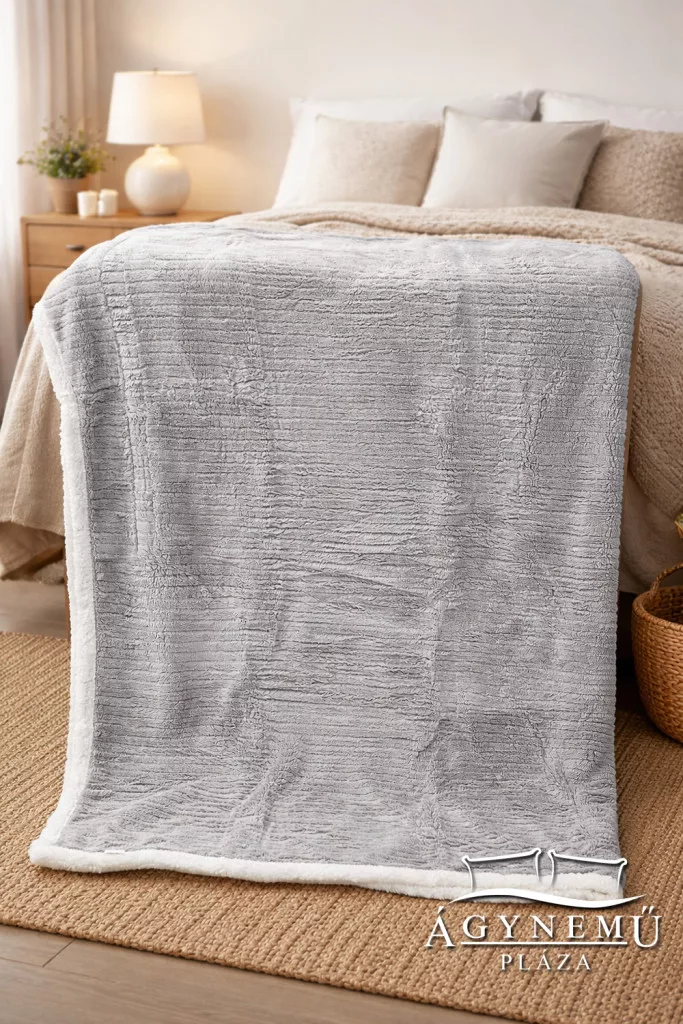 Világos szürke csíkos polár pléd, és fehér Sherpa