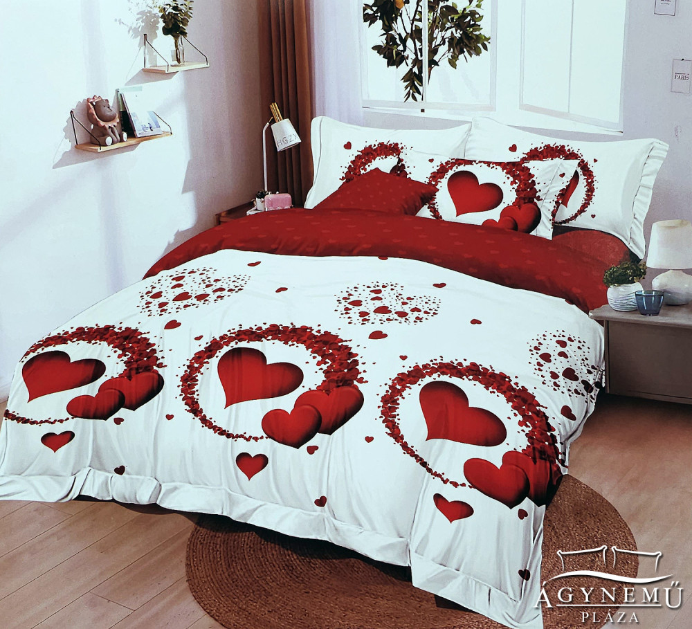 Fehér alapszínen, nagy piros szíves mintázattal